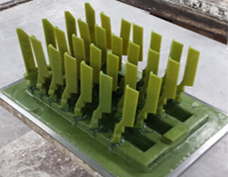 Wax patterns are attached to gating (flow channels) and mounted to an aluminum plate.